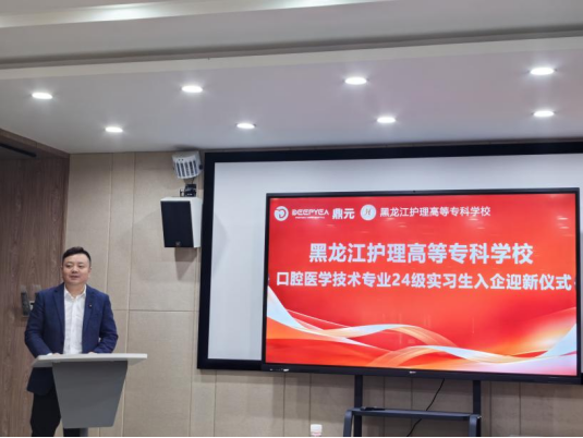 口腔医学系党总支书记隋红代表学校致辞。首先对黑龙江鼎元牙科科技有限公司多年来对学校教学、实习工作的支持表示感谢,并指出实习是学生从理论走向实践、从学校走向社会的重要桥梁。希望同学们在实习期间能够发扬口腔医学系“精益求精”的优良传统,严格遵守企业规章制度,将书本知识转化为服务患者的过硬本领,同时要求大家在实习中注意安全、虚心求教,展现口腔学子的良好精神风貌。